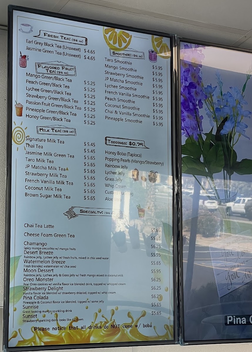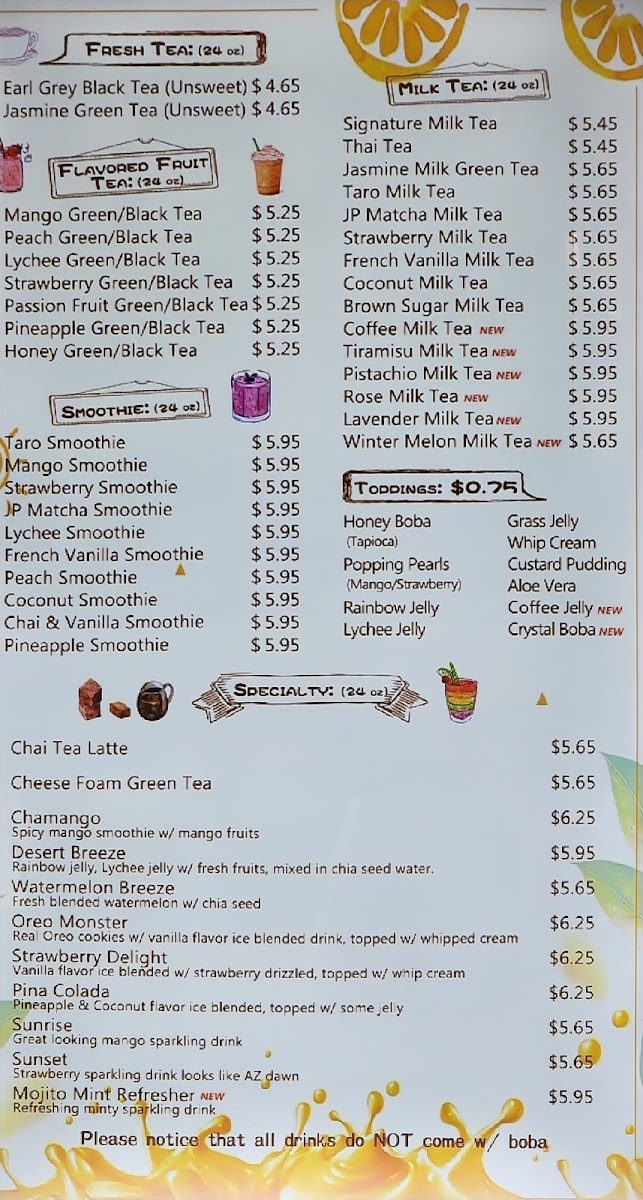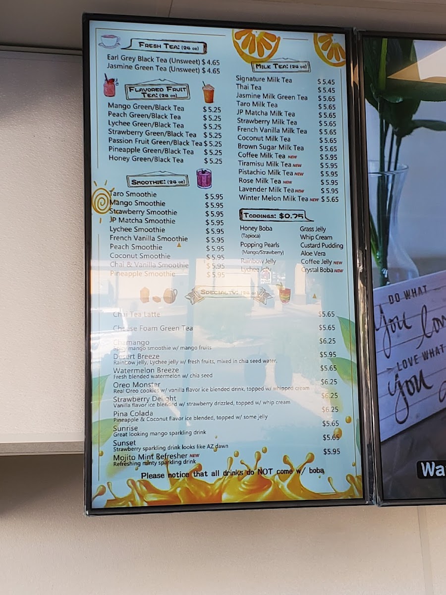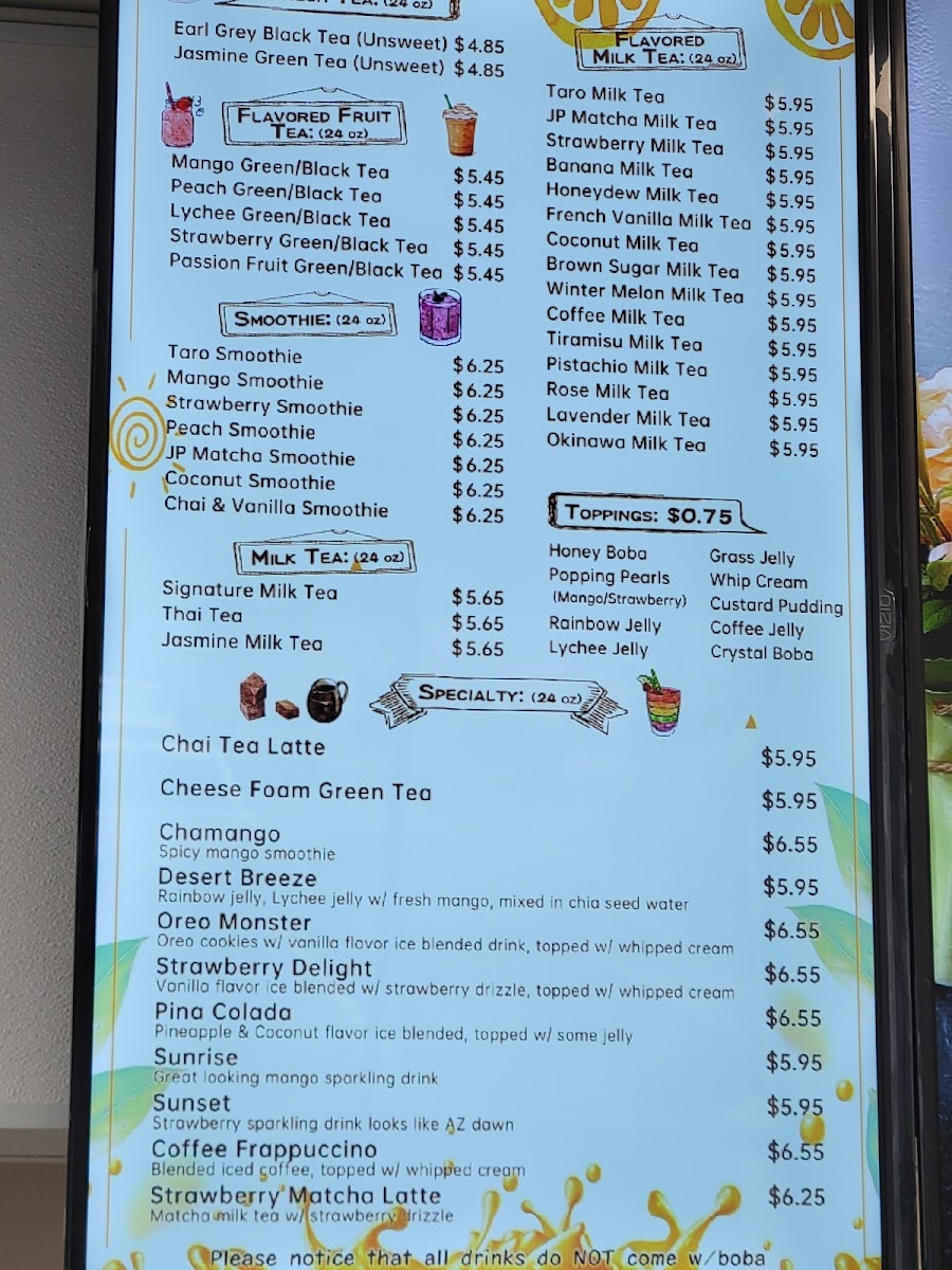 The menu features a selection of flavored fruit teas like mango green or lychee black tea, alongside classic and creative milk teas such as taro, brown sugar, or strawberry milk tea. Smoothies and unique blends like the chamango or coconut smoothie provide satisfying, flavorful options as well. For those who enjoy a textured drink experience, toppings like honey boba, popping pearls, and aloe vera add a playful touch to your beverage.