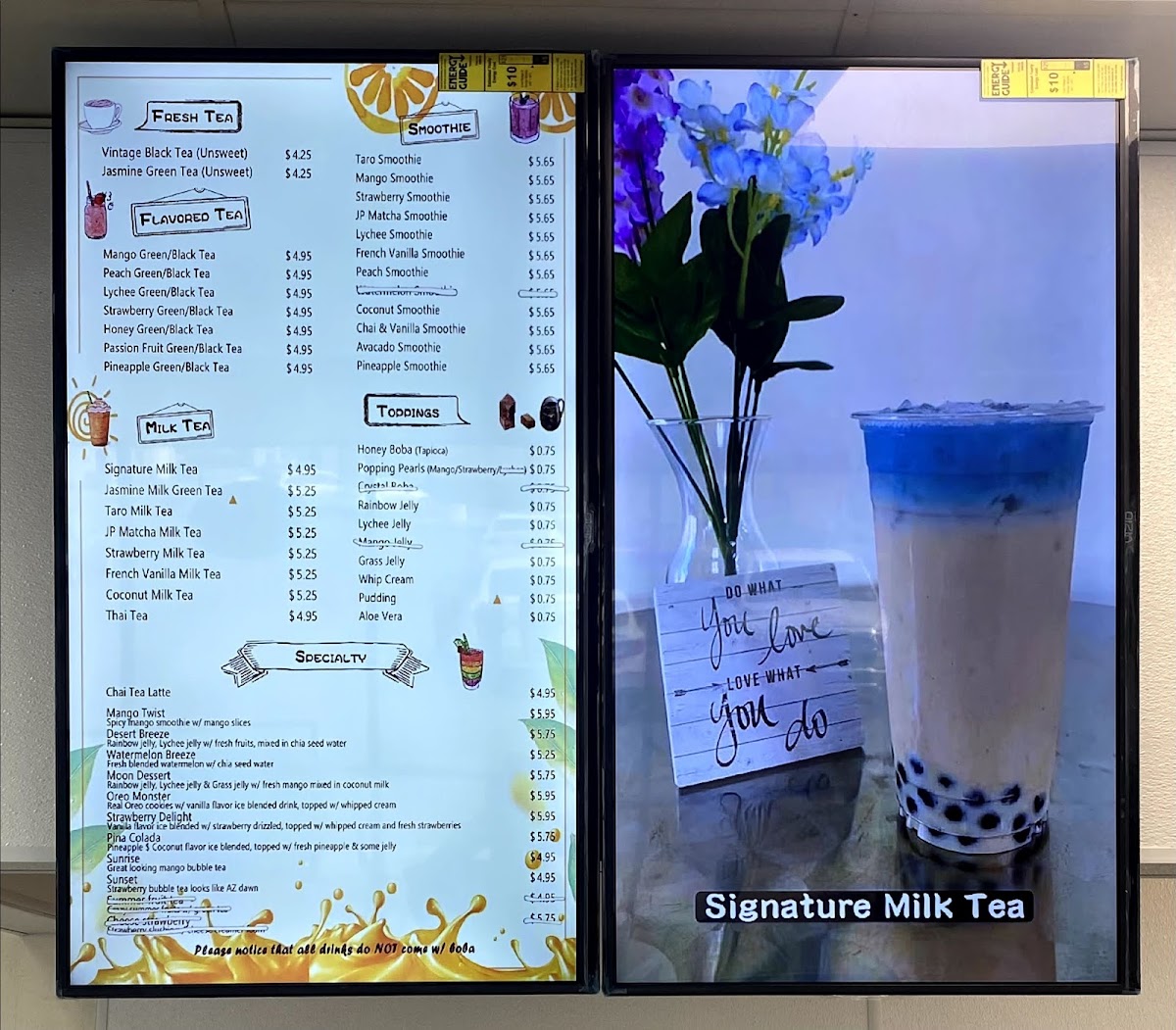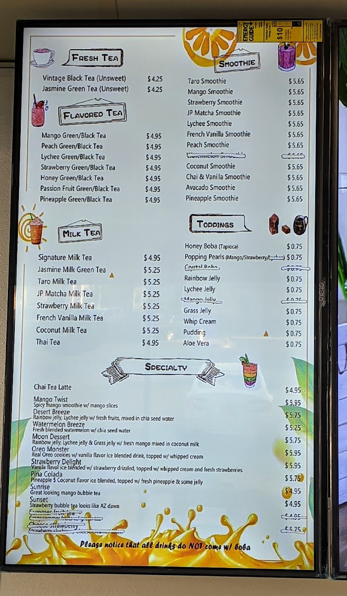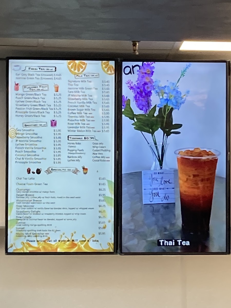 The menu features a selection of flavored fruit teas like mango green or lychee black tea, alongside classic and creative milk teas such as taro, brown sugar, or strawberry milk tea. Smoothies and unique blends like the chamango or coconut smoothie provide satisfying, flavorful options as well. For those who enjoy a textured drink experience, toppings like honey boba, popping pearls, and aloe vera add a playful touch to your beverage.